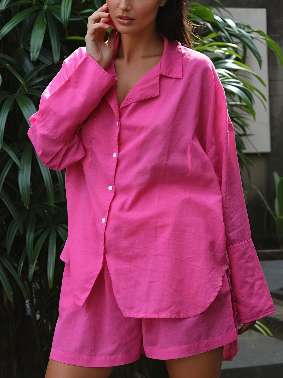 Oversized Fuchsia Cotton Shirt This oversized fuchsia cotton shirt is comfortable and practical. The straight...